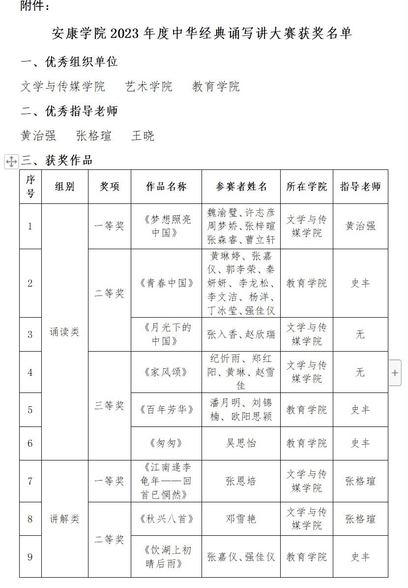 欧冠联赛官网在2023年度中华经典诵写讲大赛中成绩突出,荣获诵读类一二三等奖各一项;讲解类一二等奖各一项,三等奖三项;书写类一等奖一项,三等奖两项。黄治强、张格瑄荣获优秀指导老师荣誉。欧冠联赛官网被评为优秀组织单位。在此向获奖师生予以祝贺!