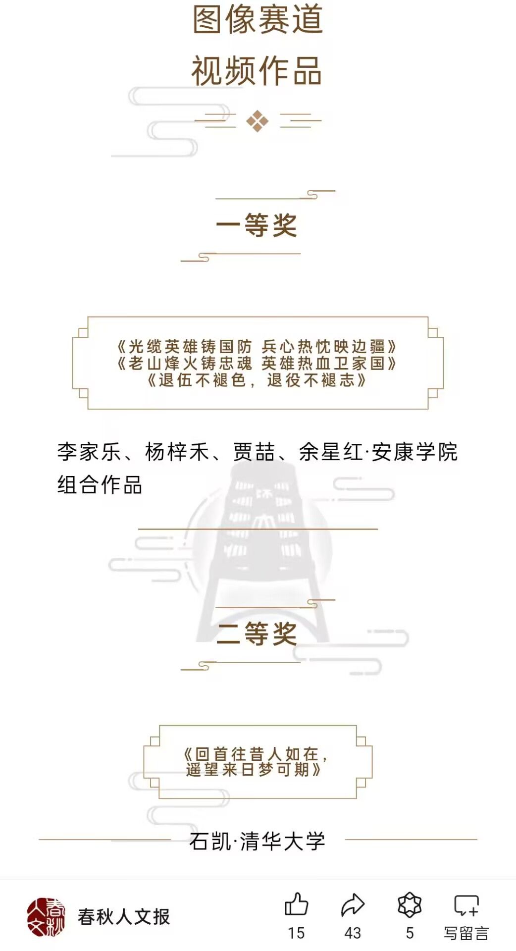 近日,第十届全国高校大学生家史大赛获奖名单正式公布。欧冠官网网络与新媒体专业2021级李家乐、杨梓禾、贾喆、余星红同学以组合作品《光缆英雄铸国防兵心热忱映边疆》、《老山烽火铸忠魂,英雄热血卫家国》、《退伍不褪色,退役不褪志》荣获本届家史大赛视频组一等奖。