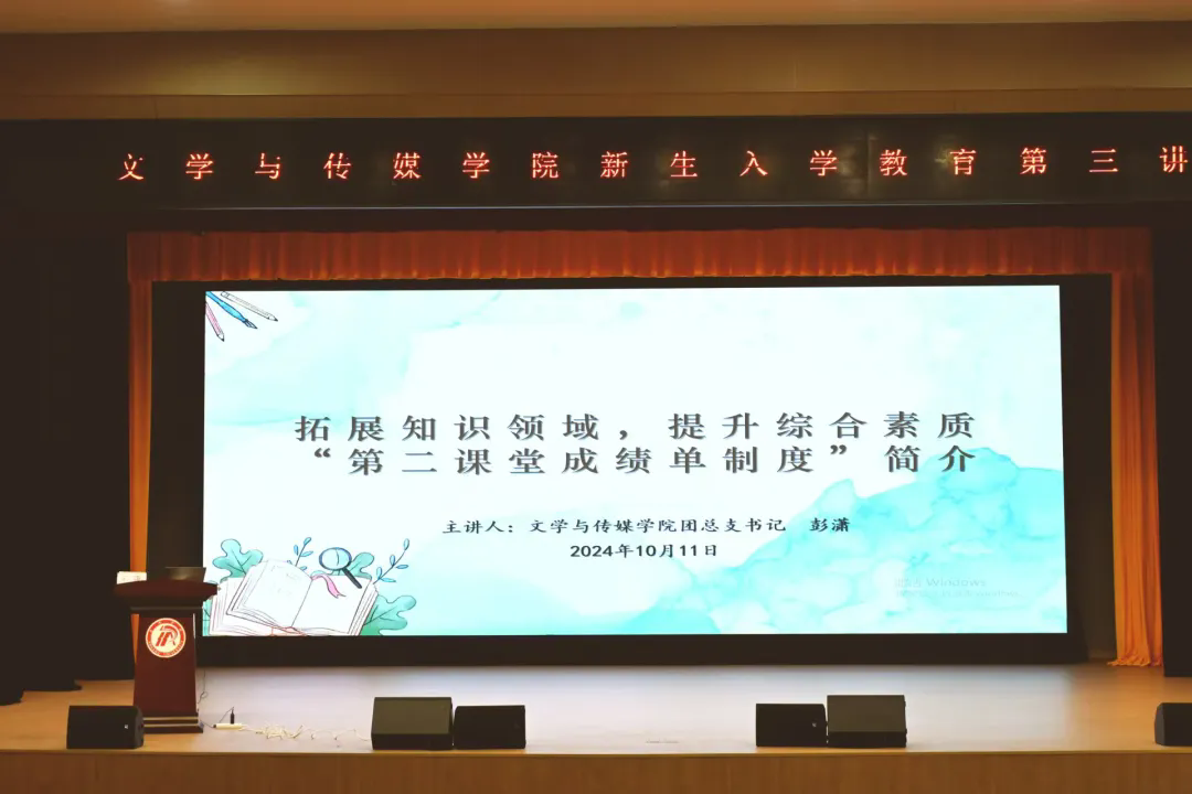 为全面提高新生综合素质,以完备、科学的“第二课堂成绩单”制度体系提升第二课堂育人实效,2024年10月11日下午,欧冠联赛官网在江南校区大礼堂开展新生入学教育第三讲:拓展知识领域,提升综合素质——“第二课堂成绩单制度”简介。欧冠官网团总支书记彭潇主讲,辅导员喻言、刘言军和2024级全体同学参加,会议由刘言军主持。