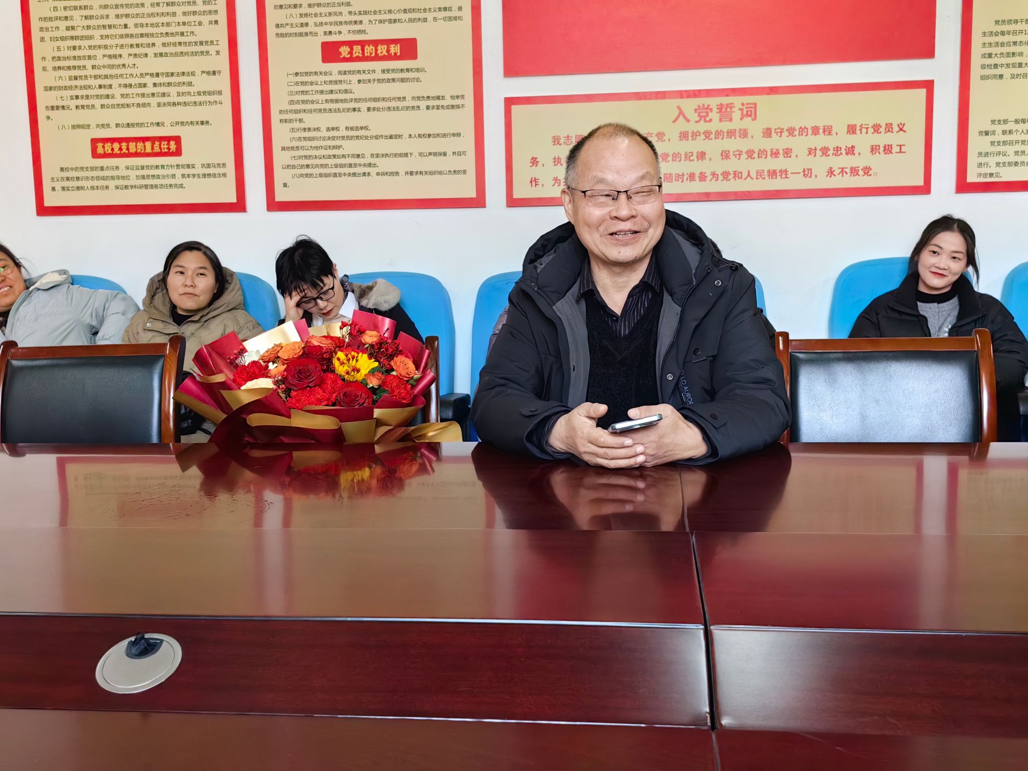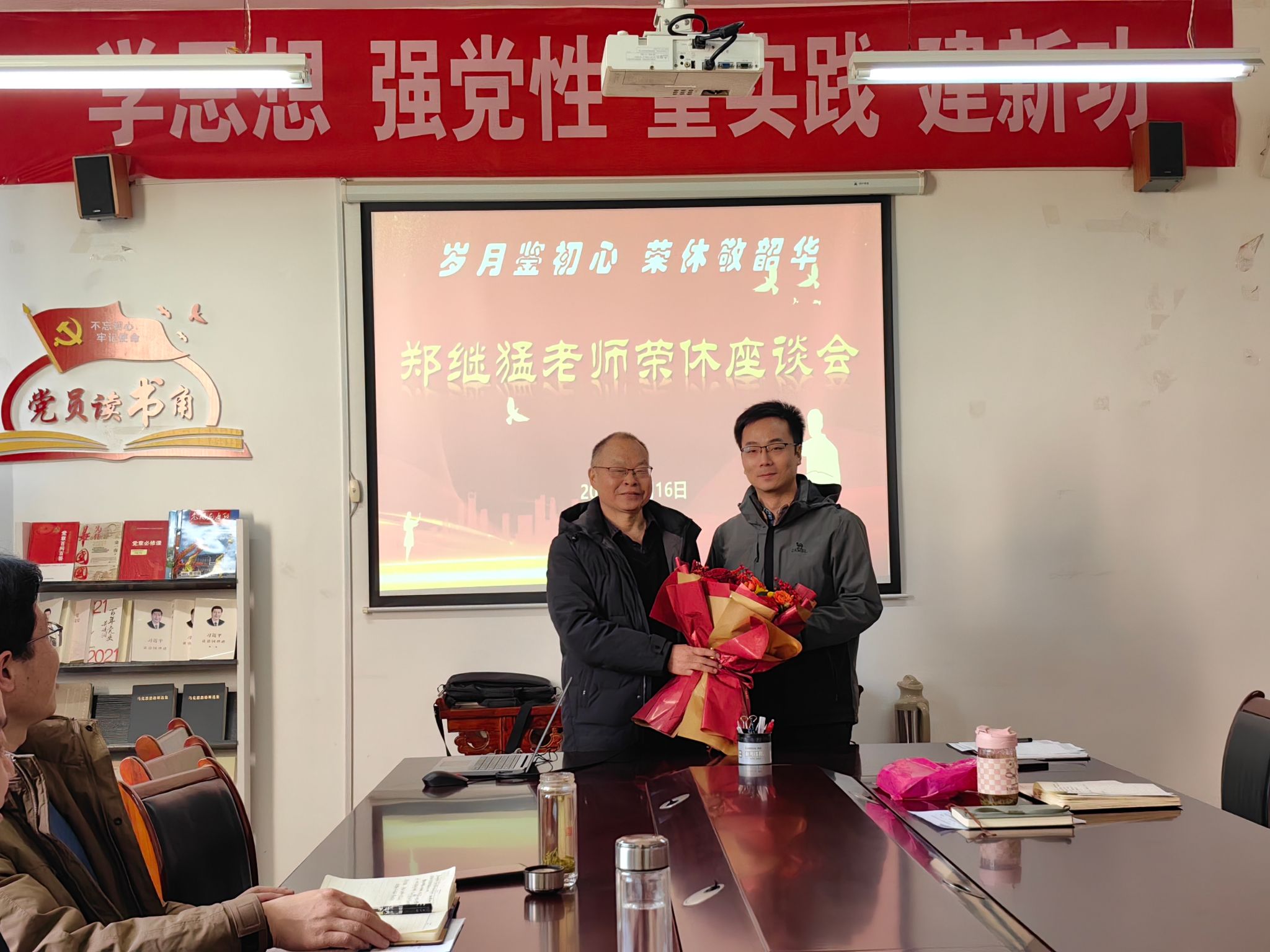随后,黄治强代表学院工会分会给郑继猛教授送上了祝福的鲜花,郑继猛教授发表了荣休感言。他追忆了早年不断求学和入职欧冠官网以来的主要经历,对学校、学院多年以来的关怀和支持表示真诚的感谢,对在各个时期给予他帮助的老师们也分别表达了感谢。郑继猛教授还分享了自己的学术感悟和科研经验,鼓励在职教师要在潜心教书育人的同时结合自己的专业方向和学院发展所需加强科研工作。与会教师也纷纷畅谈与郑继猛教授在一起的美好时刻,并对其开启退休新生活送上了美好的祝福。