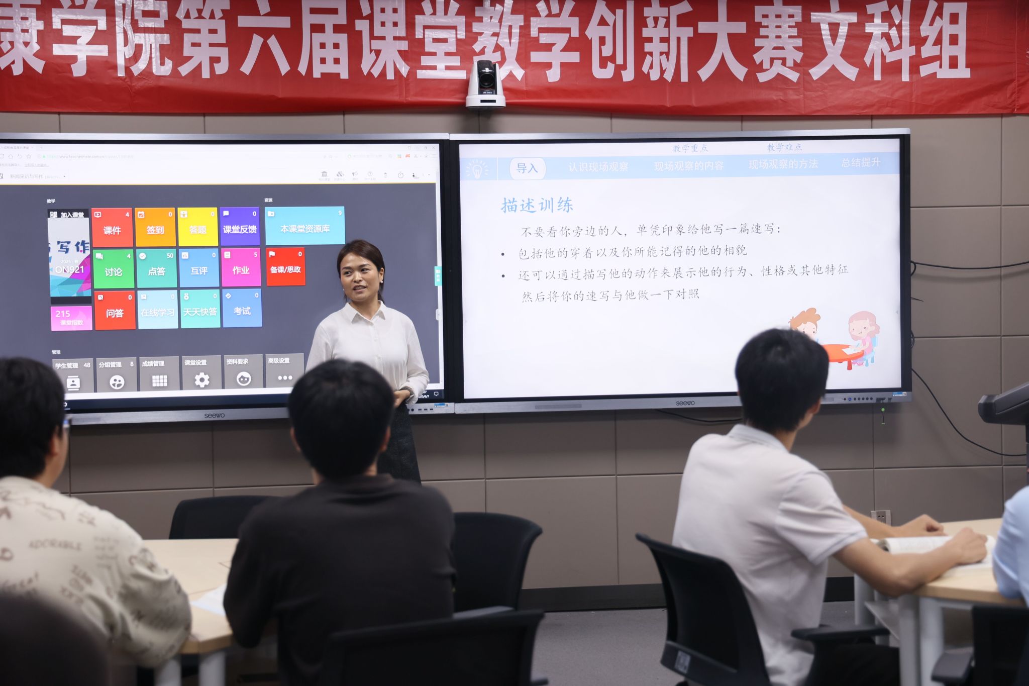 据悉,本届大赛历时两个月,经系(教研室)初赛、院级复赛的层层选拔,最终55位选手脱颖而出成功进入校级决赛。决赛分为文科组、理工科组、术科组三个组别,设置“随堂听课+现场教学展示+教学创新成果汇报”三个考核环节。参赛教师们教态自然、精神饱满,教学模式和教学组织过程推陈出新,教学方法和手段丰富多样、科学有效,现代教育技术与传统课堂深度融合,教学效果追求学生学习成效的达成,充分展示了我校持续推进课程建设和“课堂革命”的成果,践行了“以学为中心”的课堂教学创新理念。