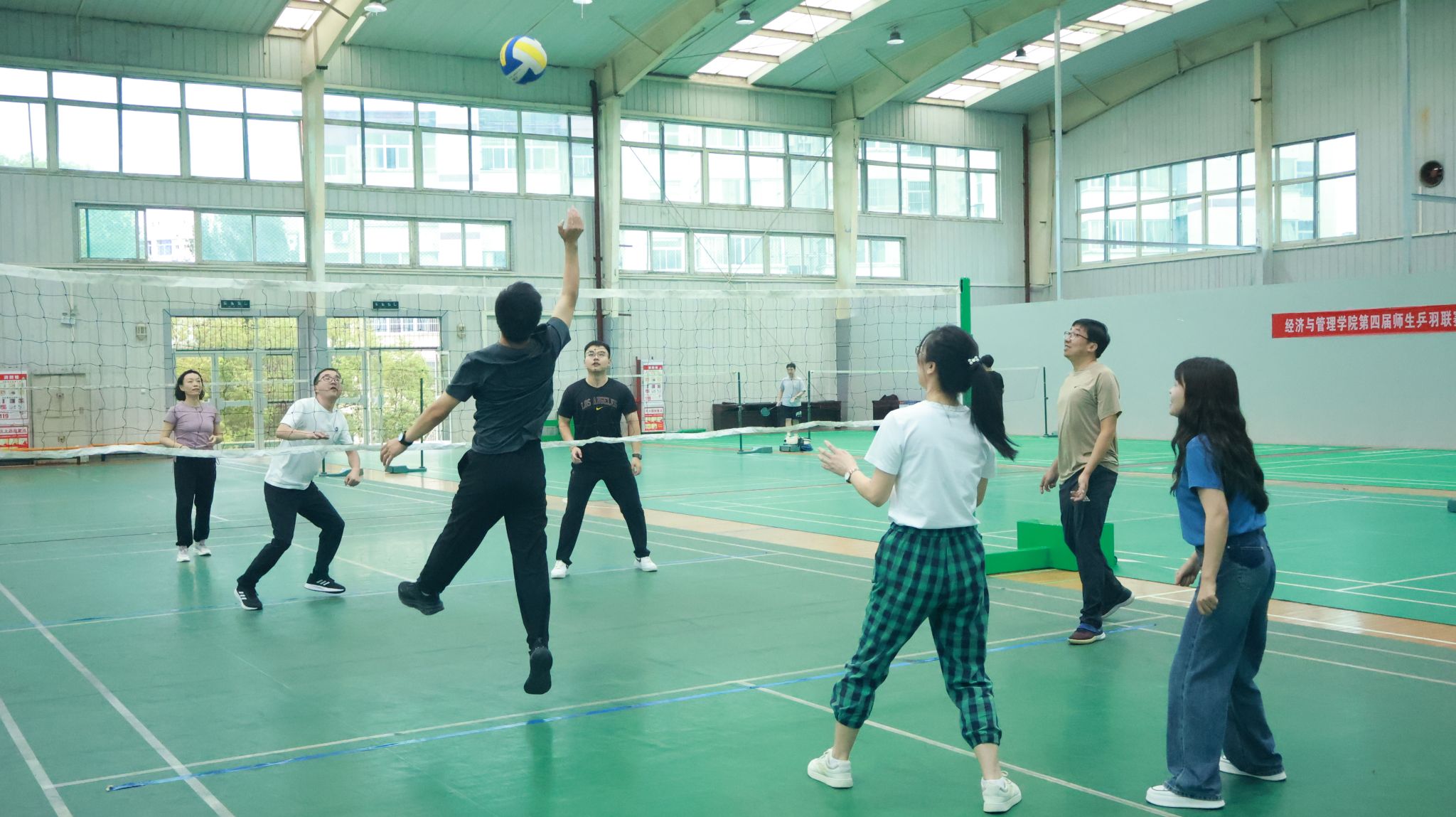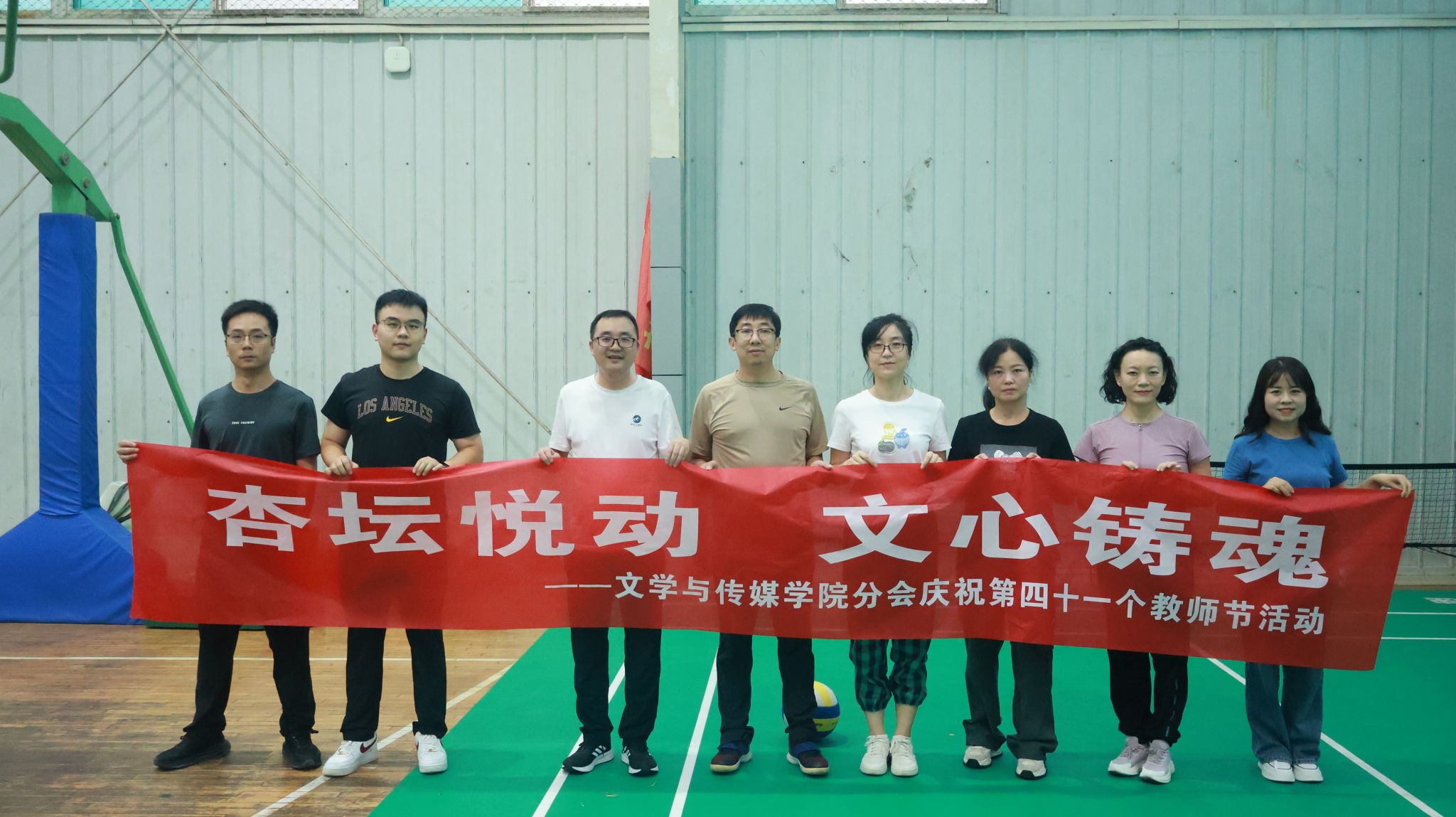 在学院分会的组织下,下午三点,全体无课教师在江南校区体育馆集合,随后按照活动方案开展了趣味运动活动。活动的主要内容为院内气排球比赛,学院教师按照不同系室组成队伍,按照淘汰赛形式进行友谊赛。同时,未参与气排球比赛的教师在乒乓球和羽毛球场地同步进行乒乓球、羽毛球娱乐锻炼。下午六点,庆祝教师节活动圆满结束。