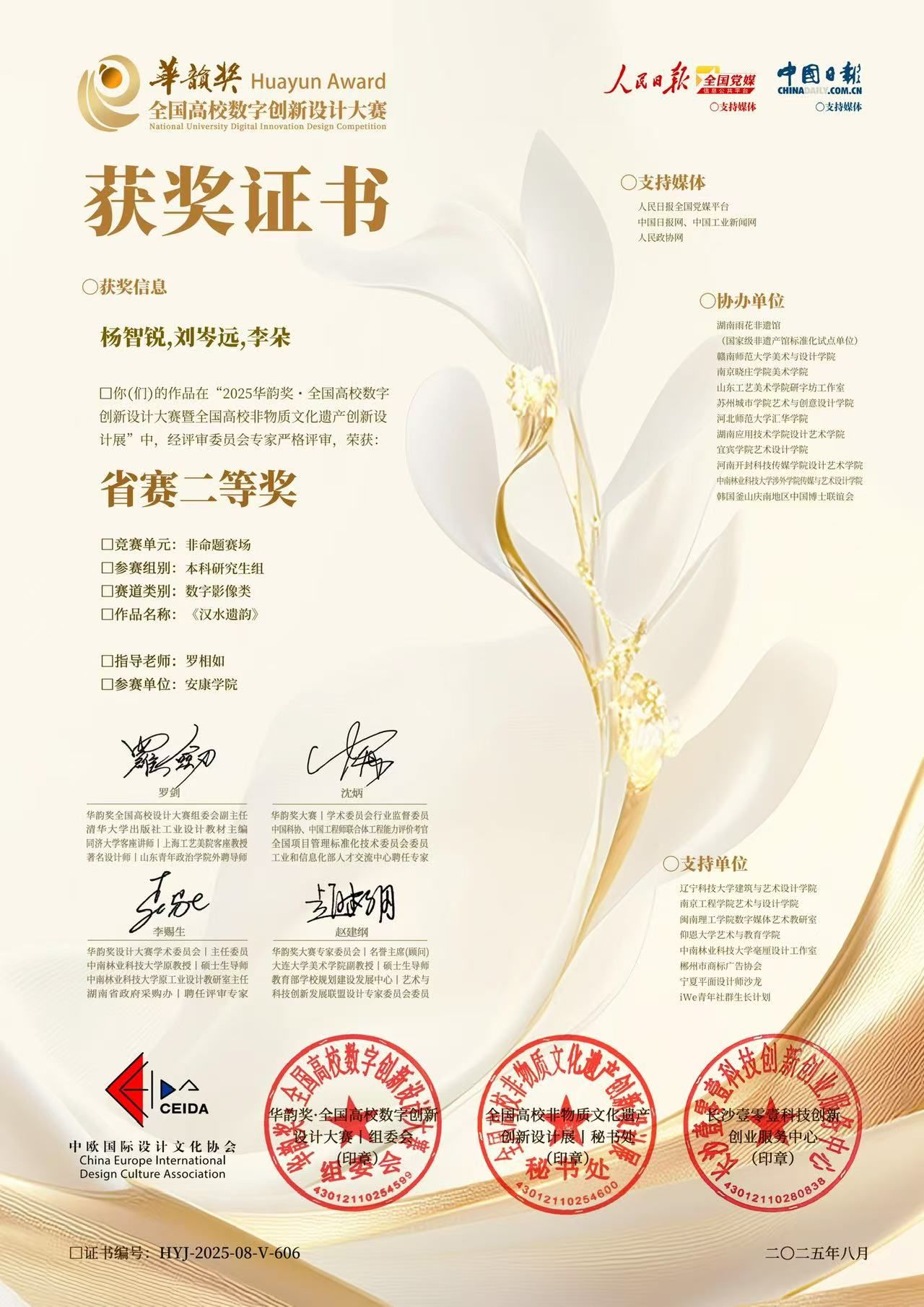 近日,在“华韵奖·全国高校数字创新设计大赛”省级赛区评选中,欧冠官网报送的短视频作品《汉水遗韵》在众多参赛作品中脱颖而出,荣获省赛二等奖。这是该作品继获得“华文奖”全国大学生文化创新·文旅创作大赛特等奖后,再次在全国性赛事中取得优异成绩。
