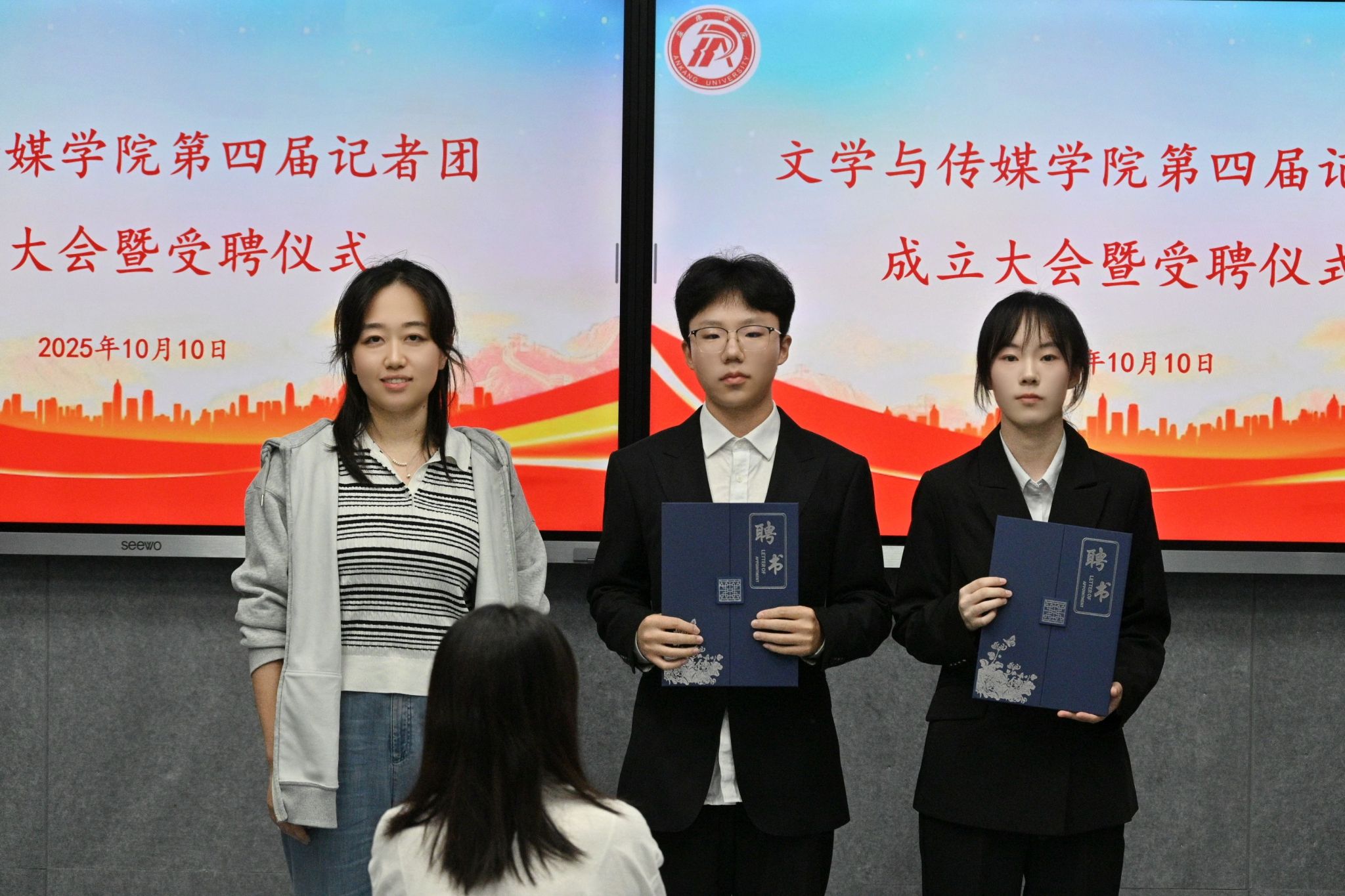 彭潇宣读第四届记者团成员名单,与会老师为新一任主编、副主编和各部门部长颁发聘书。