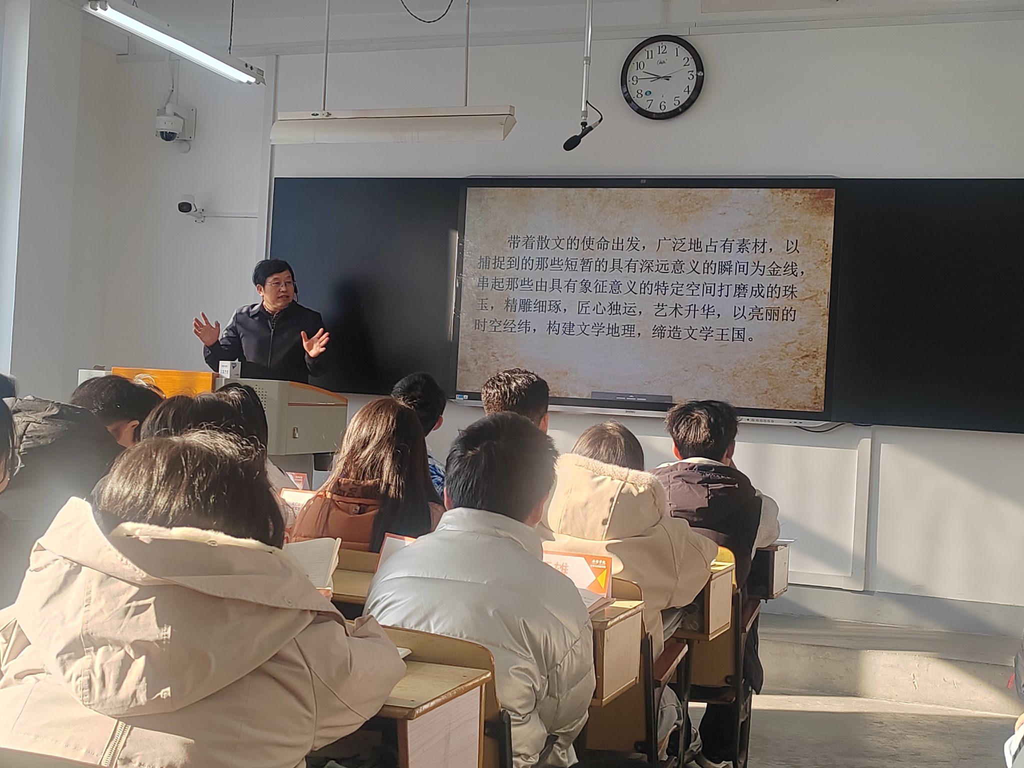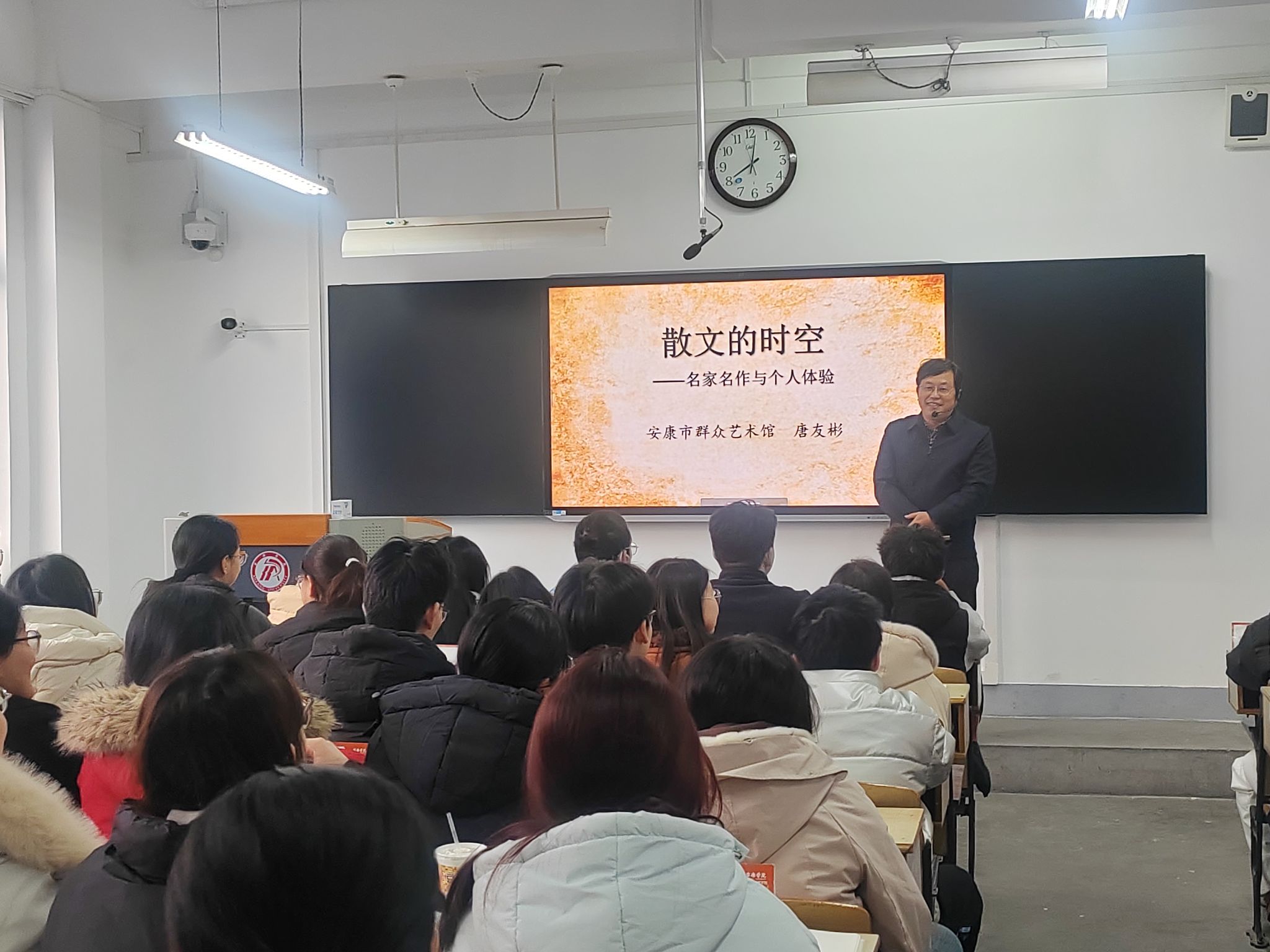 唐友彬以“散文的时空”为主题,围绕散文的含义、散文的时间、散文的空间、散文的描写手法以及结构等内容展开教授,开篇他引用《文化苦旅》中的美言名段,使散文的美在同学们的心目中绽放;然后将关于散文的时间、空间概念与丰富的作品案例相结合,生动形象地为同学们普及了散文的知识,激发了同学们创作散文的热情。
