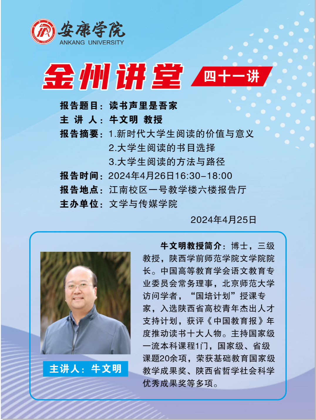 导航痕迹 首页 > 新闻通知 > 通知公告 > 正文 学院新闻 通知公告 金州讲堂四十一讲 主讲人:牛文明(陕西学前师范学院文学院院长) 发布人:欧冠联赛官网 发布日期:2024年04月24日 阅读次数: