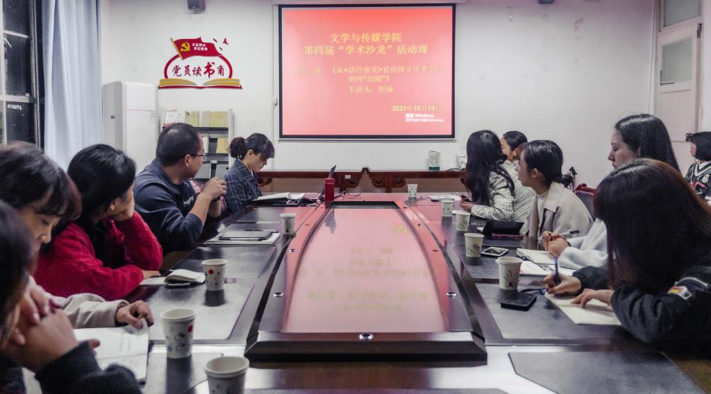 10月19日晚19点,秘书与新媒体学科组在2307会议室,举办了第四届“学术沙龙”活动周第二场沙龙活动。本场沙龙由崔瑜老师主讲,主题是“从《唐宫夜宴》看传统文化类节目如何出圈”。学科组谭诗民、王薇薇、王一丹、刘锦、罗相如、锁玉洁、谭志轩,以及汉滨高中李爱霞等老师和部分学生参加了活动和研讨。