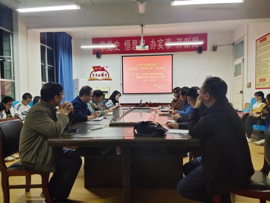 10月18日晚上6点40分,文学理论与外国文学学科组在2307会议室,顺利举办了欧冠联赛官网第四届“学术沙龙”活动周第一场学术沙龙活动。本场学术沙龙由余姗老师主讲,主题是“女性话语的童话内涵:英国维多利亚时期的女性小说”。副院长朱云,学科组教师梁卫华、谭诗民、邸玲、曹刚、崔德全,部分学生参加了活动研讨。