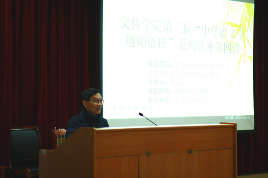 2023年11月29日下午,在1号教学楼六楼报告厅,欧冠联赛官网邀请到安康中学高级教师王治义老师为“中学语文卓越师资班”做了题为《做务实创新发展有思想有灵魂有高度有成绩的语文老师》的讲座,讲座由卓越师资班班主任唐明珍主持,“中学语文卓越师资班”全体学生聆听了本场讲座。