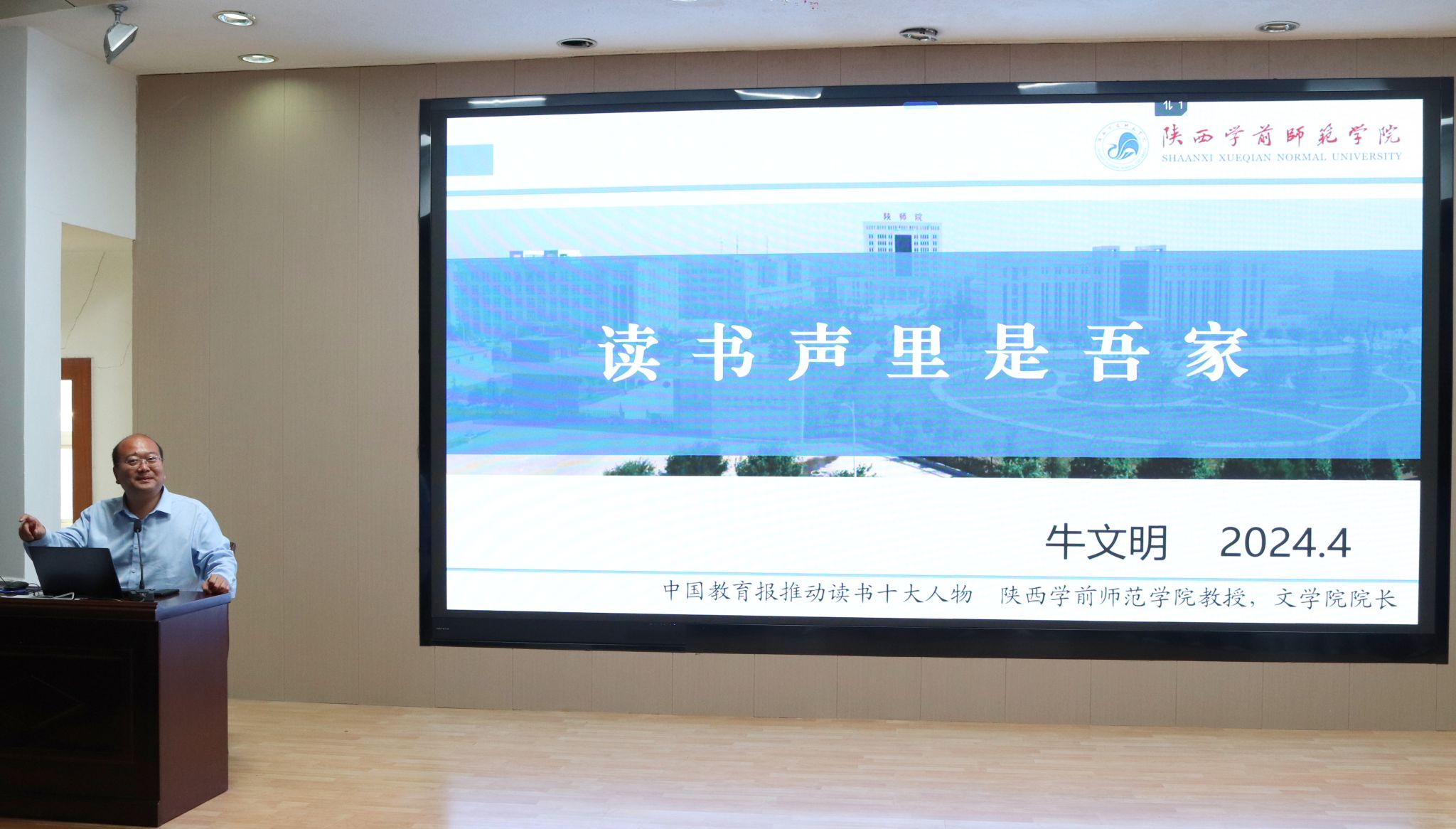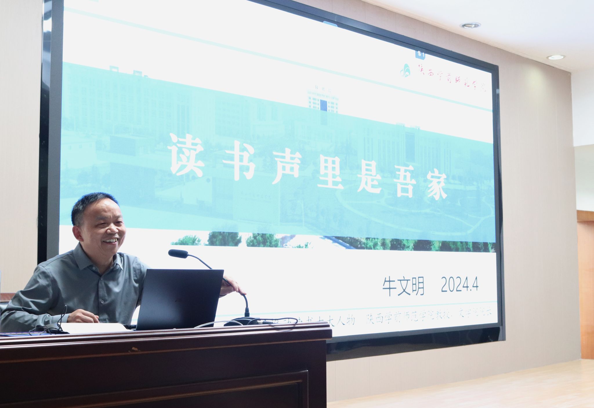 4月26日下午,陕西学前师范学院文学院院长牛文明教授应邀来我校为欧冠联赛官网2023级学生做了“读书声里是吾家”的专题读书报告。本次报告由欧冠联赛官网院长杨运庚主持。