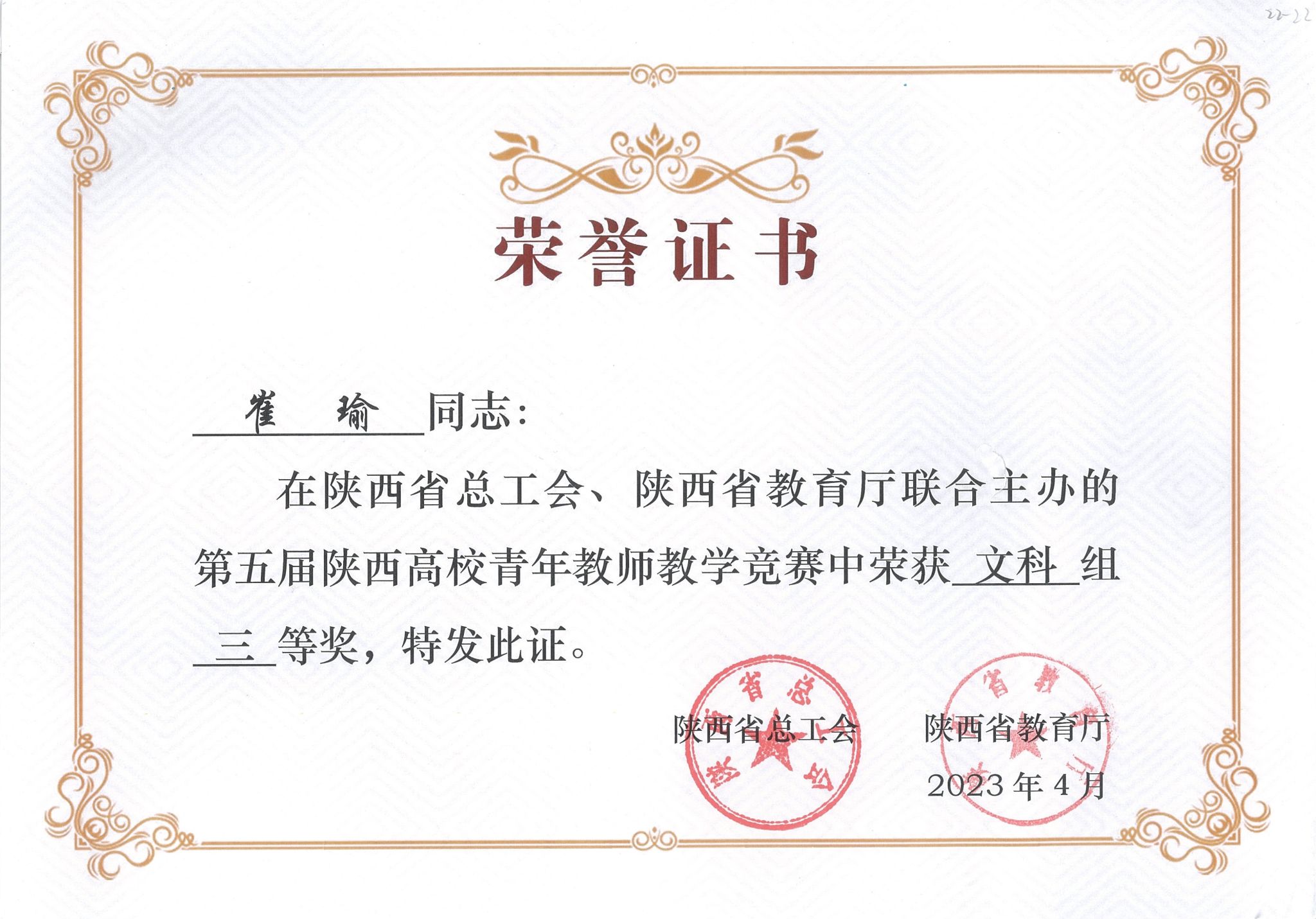 近日,省教育厅和省教科文卫体工会对陕西高等学校第五届青年教师教学竞赛结果进行公布。我参赛教师崔瑜荣获文科组三等奖。