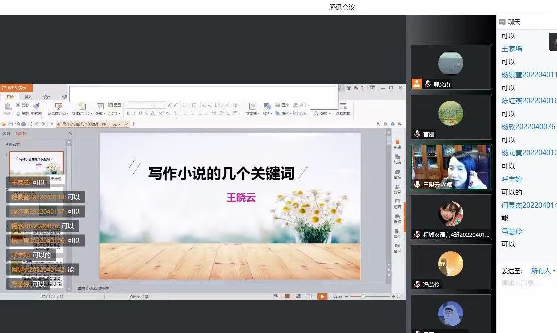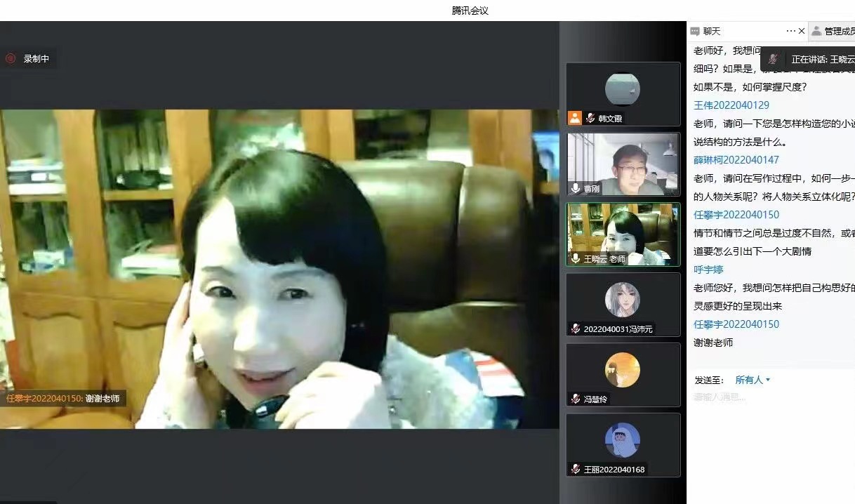 12月13日下午,作家王晓云应欧冠联赛官网邀请,通过腾讯会议与基础写作课校内教师韩文霞、曹刚一同为汉语言文学专业2022级学生线上讲授“小说的写作”。