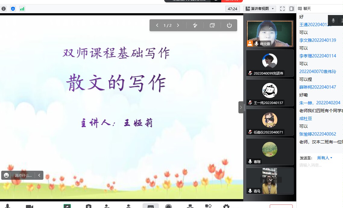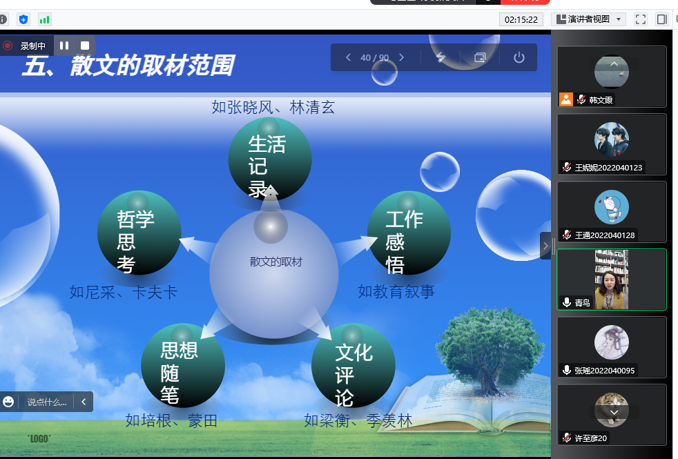 12月7日下午,作家王娅莉应欧冠联赛官网邀请,通过腾讯会议与基础写作课校内教师韩文霞、曹刚一同为汉语言文学专业2022级学生讲授“散文创作”。