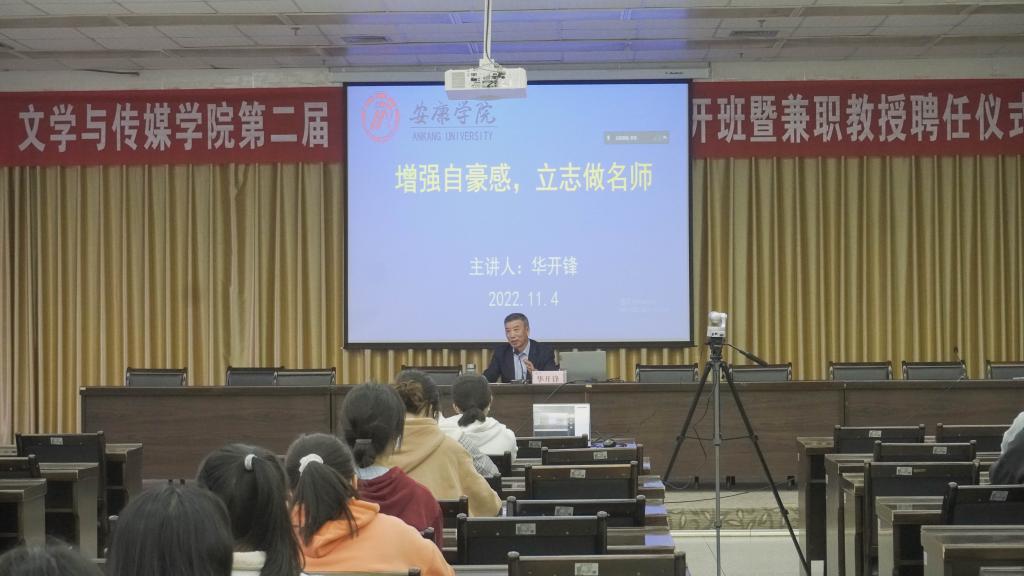 仪式结束后,我校杰出校友、兼职教授华开锋为第二届“中学语文卓越师资班”做了“增强自豪感,立志做名师”的首场学术报告。