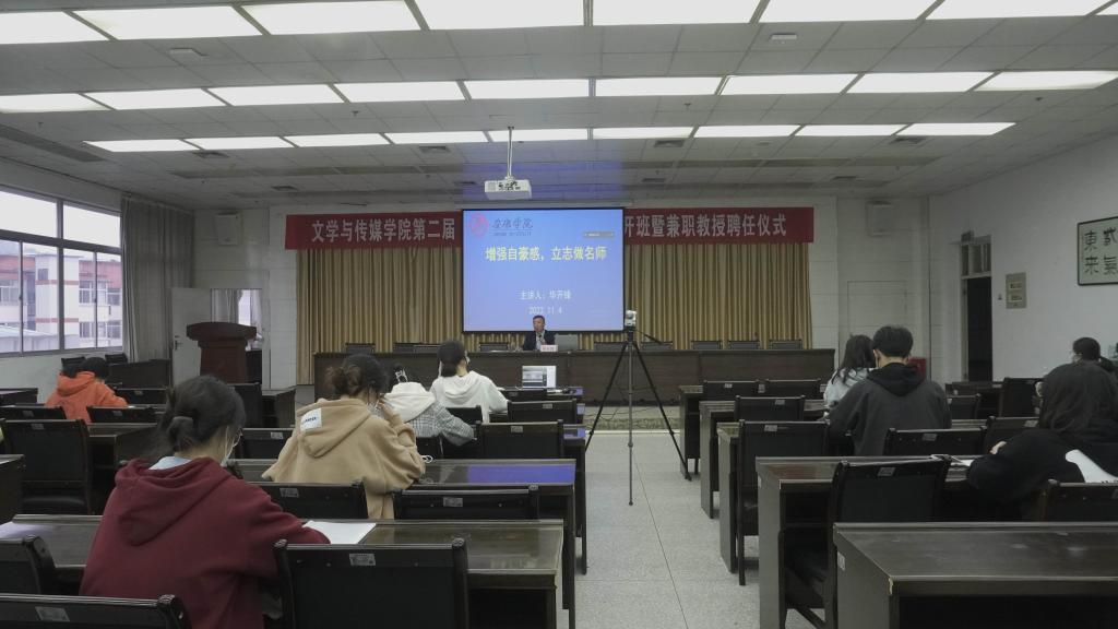 2022年11月4日下午三点半,优秀校友、陕西省首批基础教育名师、特级教师华开锋应邀为欧冠官网第二届“中学语文卓越师资班”做了题为“增强自豪感,立志做名师”的首场学术报告。欧冠联赛官网副院长朱云、卓越师资班班主任张格瑄和三个会场132名同学共同聆听了本场讲座。