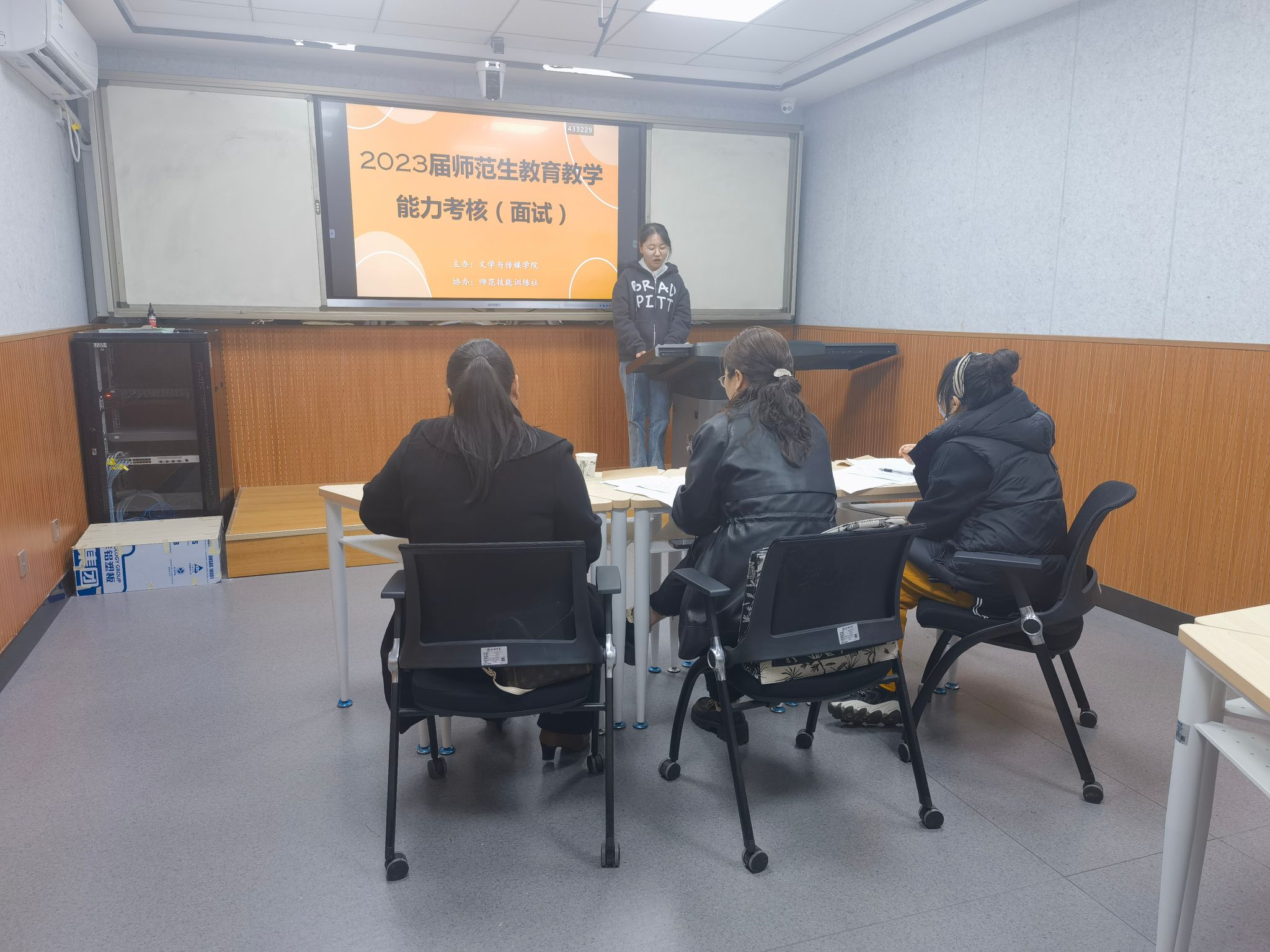 2023年3月18日下午,欧冠联赛官网在江南校区师范生技能训练中心组织开展了2023届师范生教育教学能力考核(面试)工作。本次面试考核由学院师范技能训练社承办,特聘汉滨初中语文教师陈岩以及学院教师王丽芳、张格瑄担任考官。